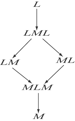 These are more powerful reduction theses than those of S3, permitting a string of L's of any length to be reduced to one, and the same for any string of M's. An examination of the diagram showing the relationships between the S3 modalities will then tell us that the proper positive modalities of S3 reduce to no more than the following six modalities for S4 with the addition of 11.4 and 11.5 to S3: L, LML, ML, LM, MLM, and M. The formulas relating these modalities (which are, of course, S4 theses as well as S3) are 10.31, 10.32, 10.58, 10.59, 10.60, and 10.61. The reader may verify for himself that the proofs of these formulas (in particular of the first two) are far more straightforward and natural in S4 than they are in S3. A diagram follows of the relations between the S4 modalities as expressed by the cited theorems.